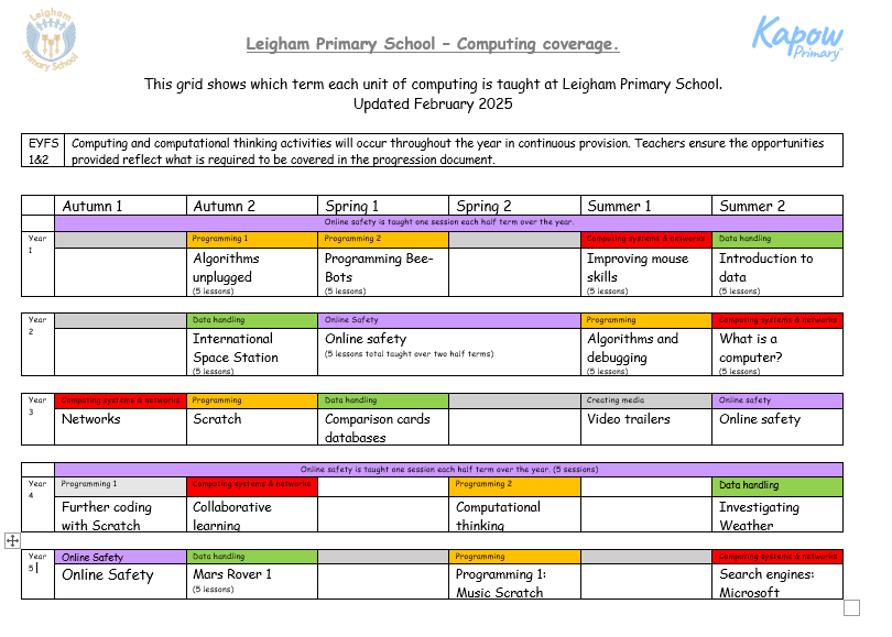The impact of our Computing curriculum will be children to leave Leigham Primary School with the skills and knowledge required to be digitally literate and safe when working online throughout their lives. We aim to excite them with new and real-life digital experiences and inspire them to explore further STEAM opportunities.