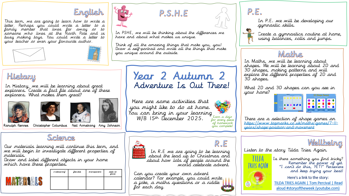 Our P.E. days are on: Tuesday and Thursday until further notice. Please make sure your child comes to school wearing their PE kit on these days.