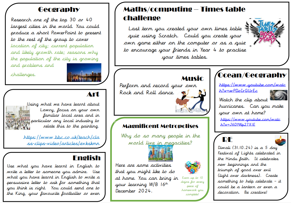 Below is a menu of activities that can be completed at home should you wish to support your child's learning at home.